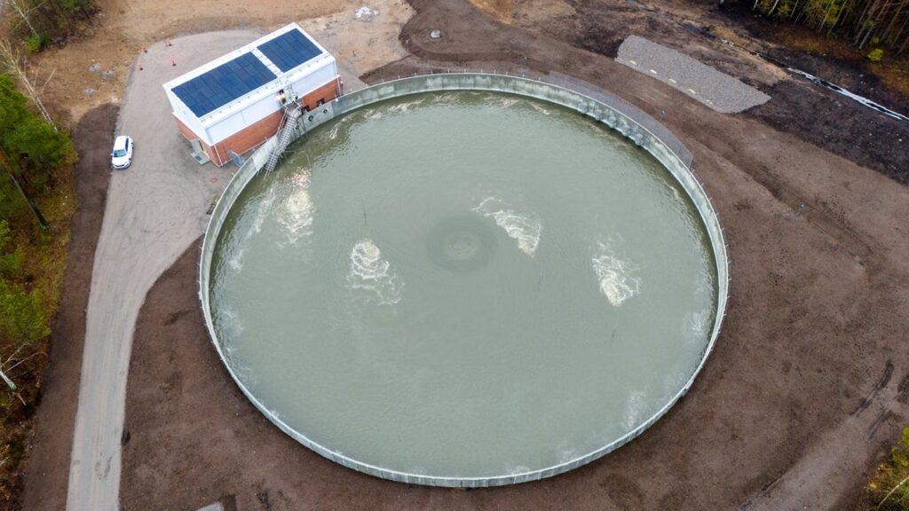Utjämningssystem med avancerade betongarbeten vid Sundets avloppsreningsverk (ARV) vid Norra Bergundasjön. Syftet med utjämningssystemet är att tillfälligt lagra överskottsvatten som